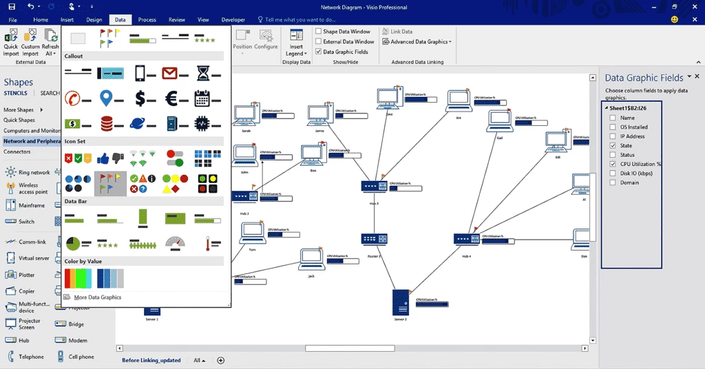 Excel, SQL Server veya SharePoint gibi birden fazla yenilikçi kaynaktan gelen verileri diyagramınıza gerçek zamanlı olarak bağlayabileceğiniz için veri paylaşım olanağına da sahipsiniz. Tek yapmanız gereken diyagramların sürekli güncellendiğinden emin olmaktır.
